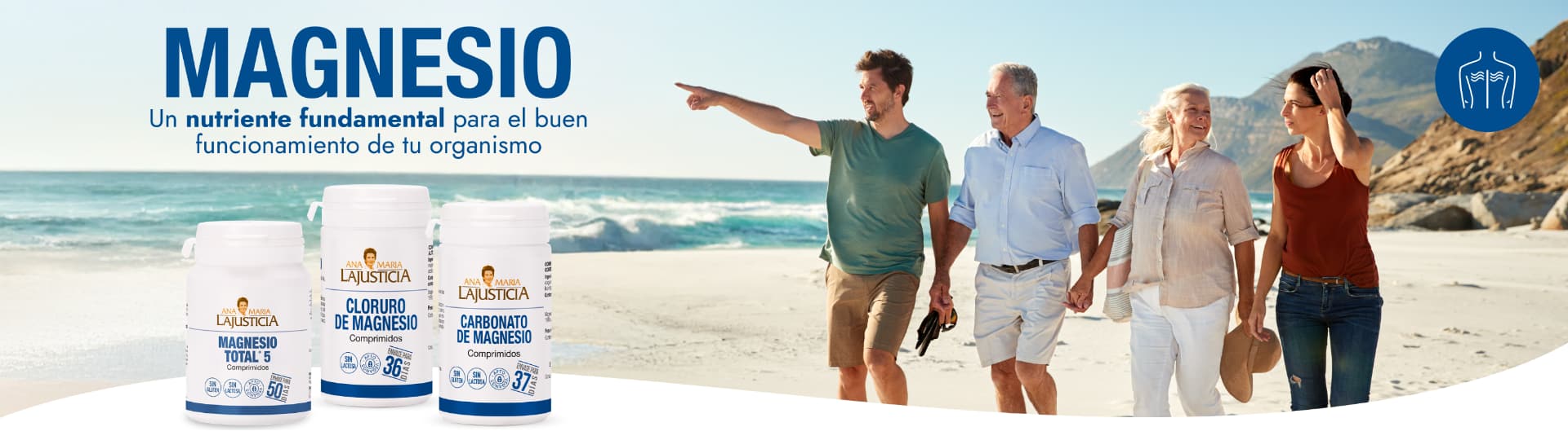 República Dominicana MAGNESIO TOTAL 5 (100 comp.) ANA MARIA LAJUSTICIA EAN 8436000686814 Magnesio total 5 100 comprimidos. Conjunto de 5 fuentes de Magnesio. Disminuye el cansancio y la fatiga y mejora el funcionamiento del sistema nervioso y musculo-esquelético. Con efecto laxante bajo. + INFORMACIÓN